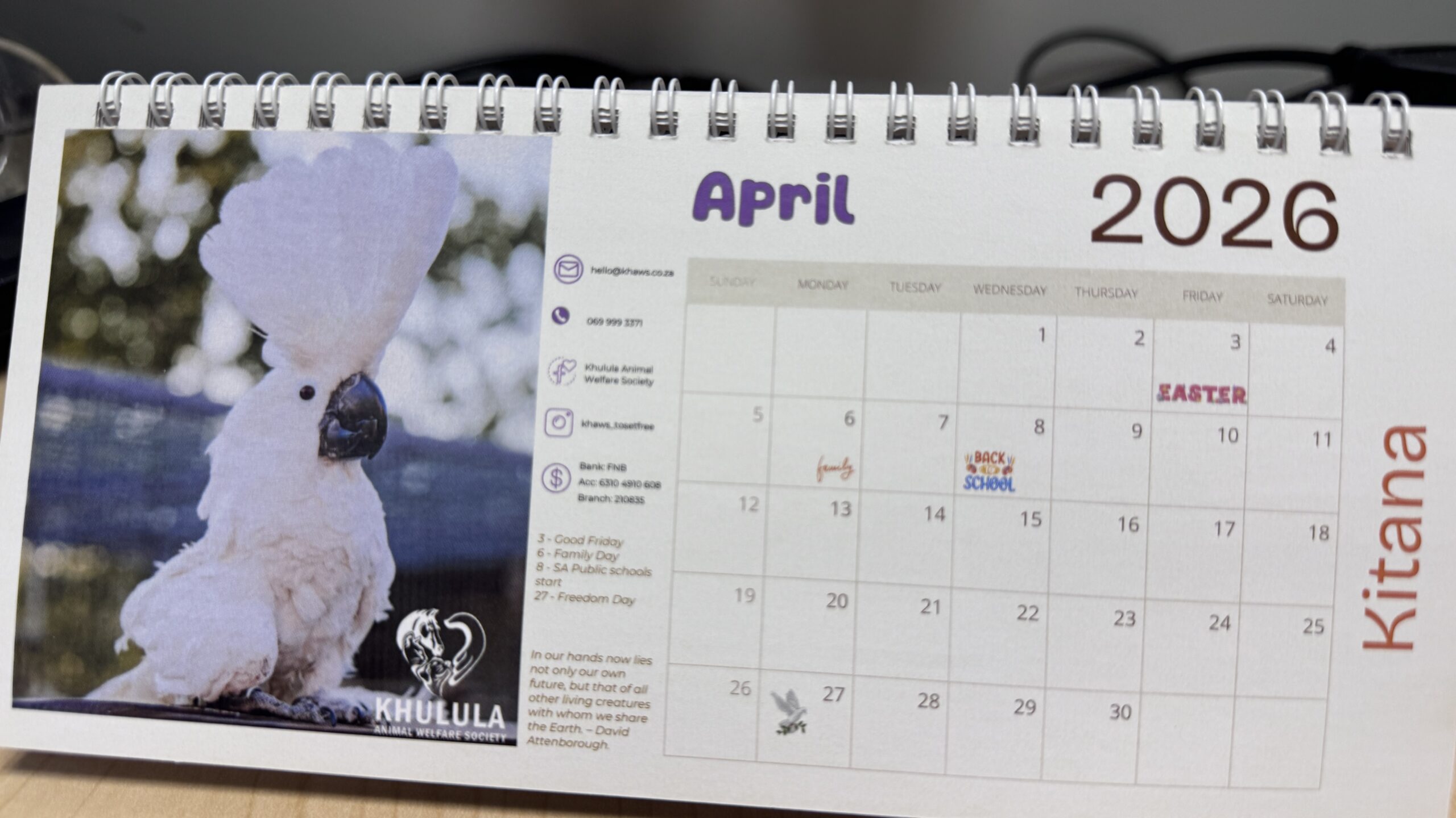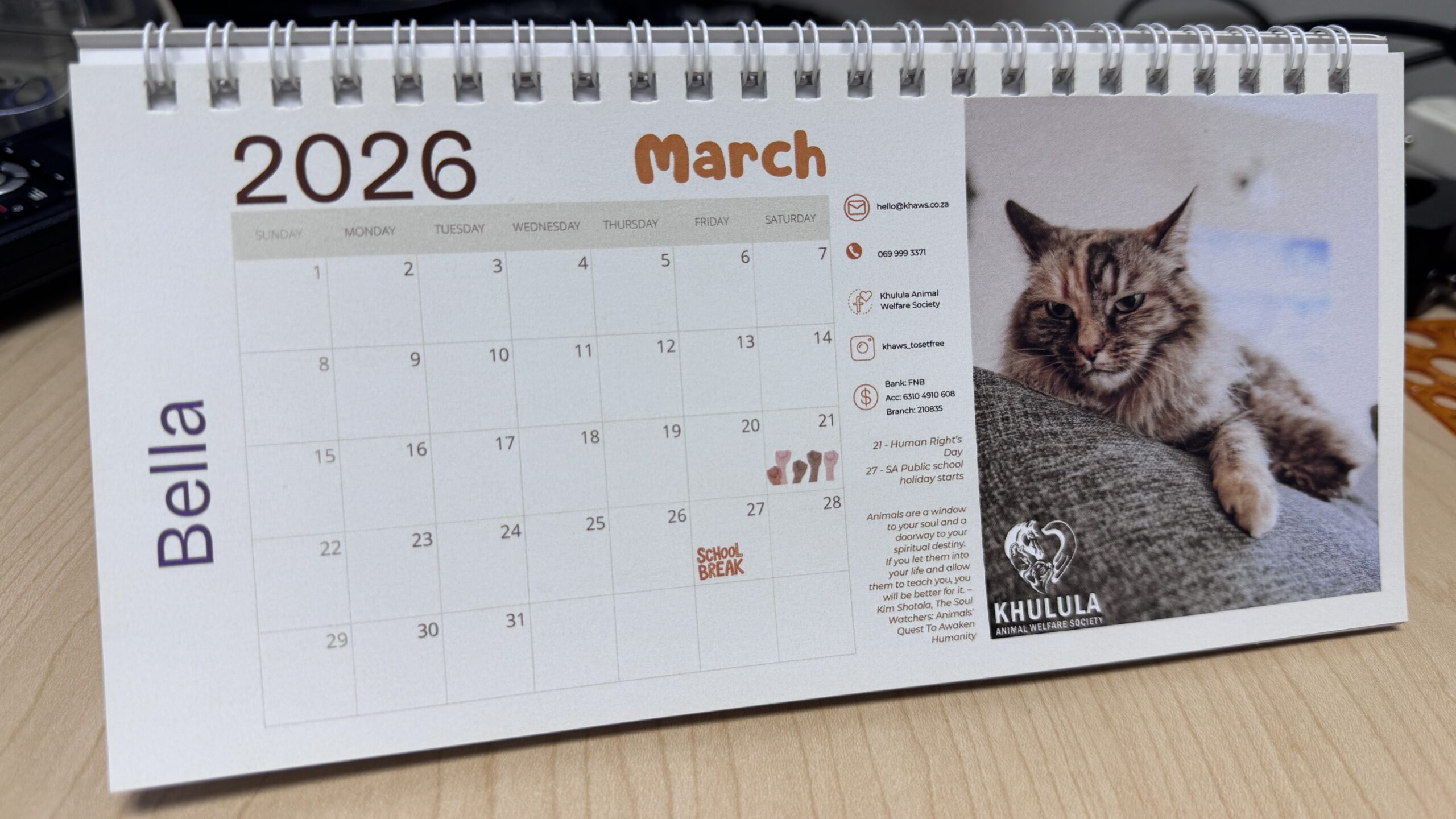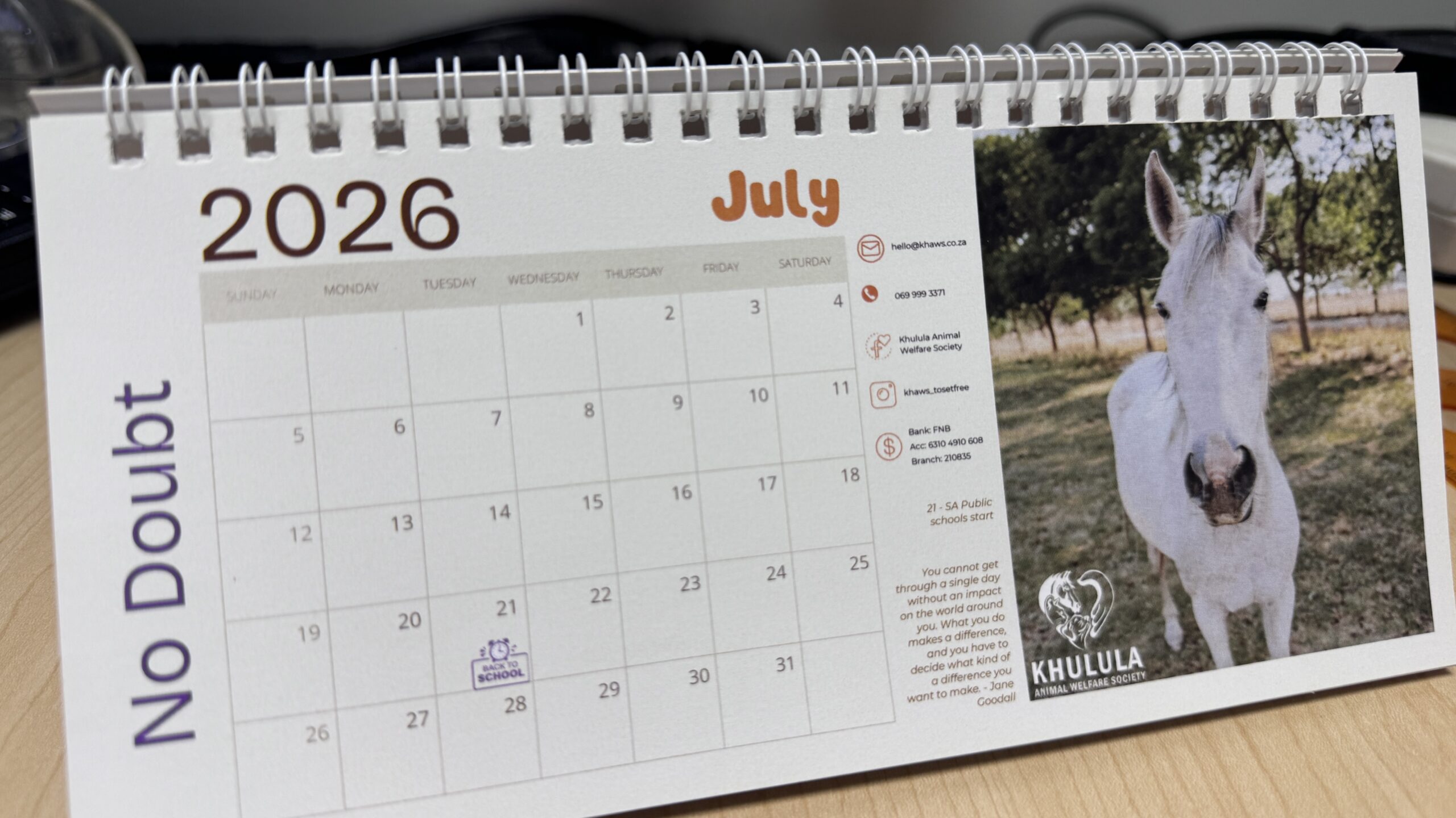 Our beautiful desk calendars are perfect for quick reference to days and dates. Each month has a beautiful photo of a animal, reminding you that your purchase of one of our calendars goes towards supporting us and every animal at Khaws.